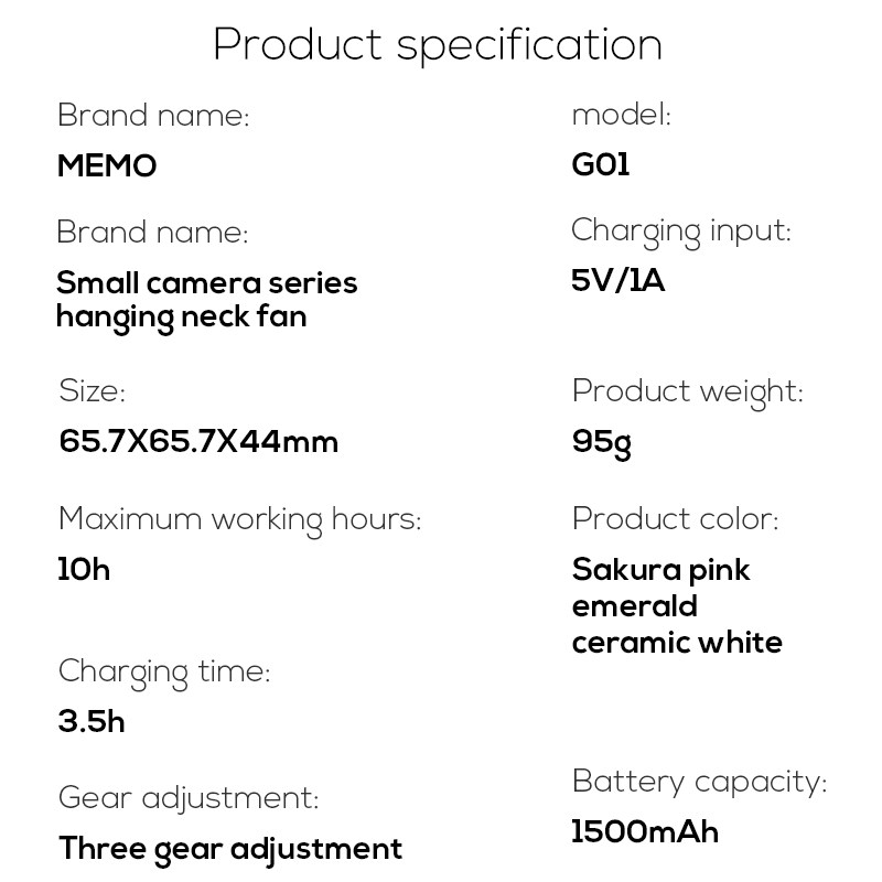 پنکه گردنی دارای باطری داخلی به ظرفیت 1500 میلی آمپر ساعت میباشد . دارای سه سرعت میباشد . پنکه بیصدا بوده و مناسب برای تمام گروههای سنی آقایان و خانم ها میباشد .با سرعت اول 10 ساعت با سرعت دوم 4/5 ساعت و با سرعت سوم 3 ساعت با شارژ کامل کار می کند
